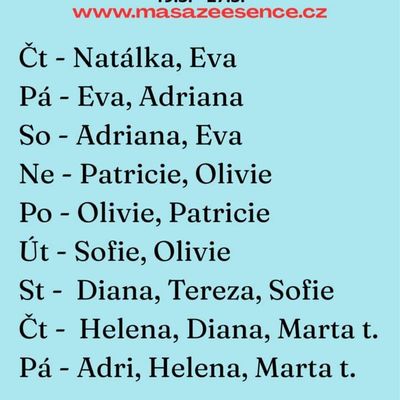 Vítám vás v salonu MASÁŽE ESENCE, www.masazeesence.cz. Jsem tu pro tebe ve středu a ve čtvrtek 25.-26.3. až do 23h. Pro více informací volejte na tel.č. 736163315. Jsem SMYSLNÁ dívka co vás ráda potěší. JEDNÁ SE O EROTICKOU MASÁŽ S RUČNÍM VYVRCHOLENÍM. Je to velice hravá a intimní masáž, do které zapojím nejen své ruce, ale i stehna, zadeček i prsa. MASÍRUJI CELÁ NAHÁ. TĚLO NA TĚLO .DOPORUČUJI: pozici 69, koupací rituál a další …. délku masáže 60min. a z důvodu hlubšího prožitku 90min. Tel. 736163315 www.masazeesence.cz